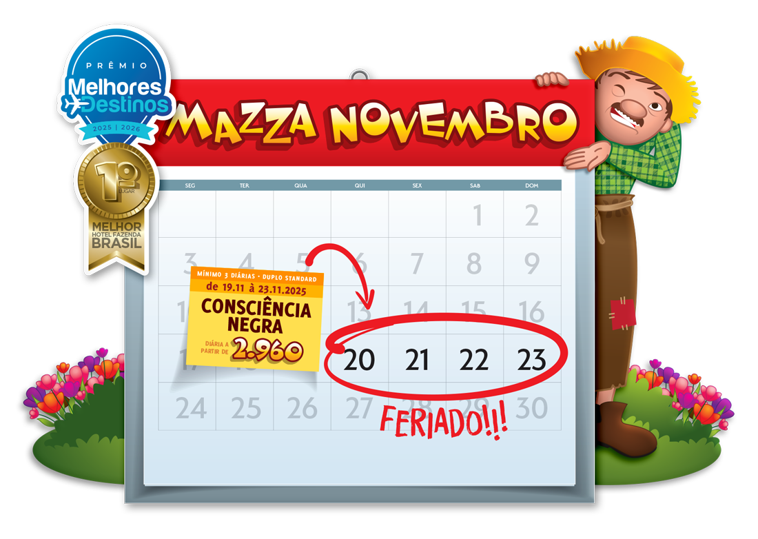 Nossa programação de lazer é cuidadosamente planejada para todas as idades, aqui no Hotel Fazenda, temos monitoria infantil todos os dias com os queridos e conhecidos Tios do Mazza, que deixam as atividades ainda mais divertidas. Muitos contos, histórias e atividades de tirar o fôlego vão deixar seus dias divertidos e especiais, além de todas as brincadeiras e atividades, no mazza você tem: quadras poliesportivas, passeios a cavalo, passeios de trenzinho, sauna, academia, campo de futebol, bocha, mini-golf, piscina coberta e aquecida, bicicletas, lago com pedalinho e muito mais…